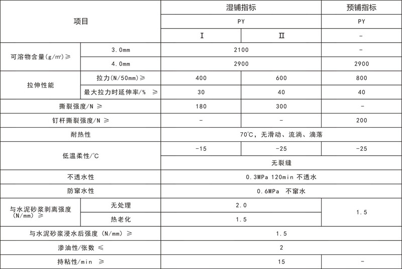 产品性能执行指标 GB/T23457-2009 PY类《预铺/湿铺防水卷材》要求。